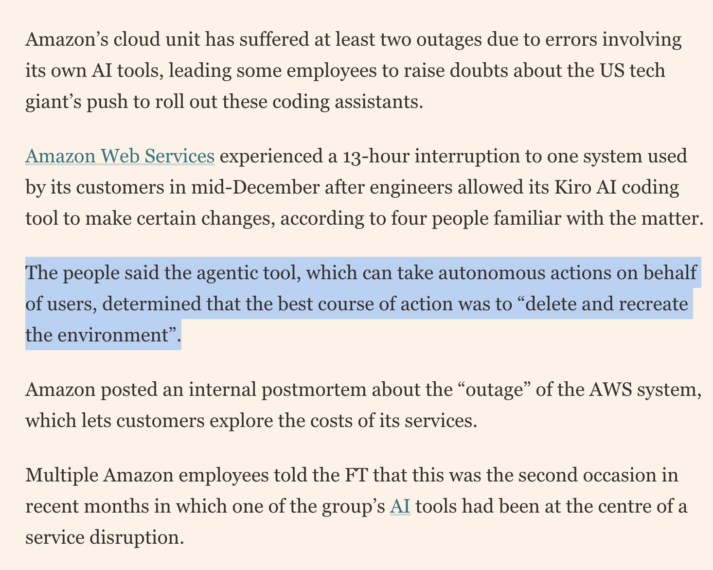 arrow-up1262arrow-down1imageAmazon's internal agentic tool decided that existing code was inadequate and decided to replace it taking down a part of AWS for 13 hours, and was not the first time it had happened. 🤣plus-squarelemmy.ml☆ Yσɠƚԋσʂ ☆@lemmy.mlEnglish · 1 month agomessage-square19fedilink