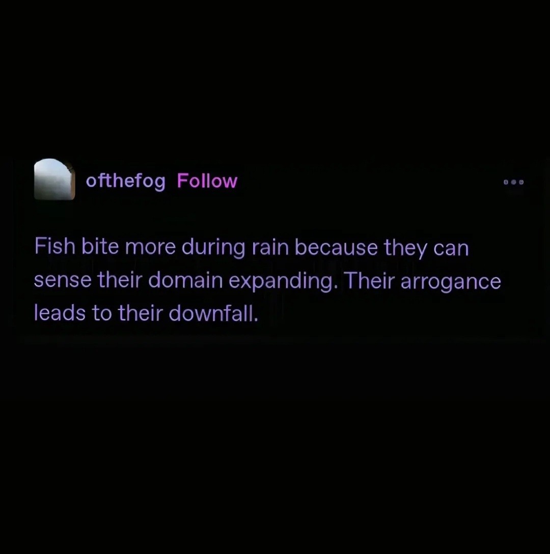 The rain makes it look like the air domain is trying to join the water world, the fish are just offering a hand for the transition, they’re trying to help, and there you are, taking advantage of their kindness. Ripping the fish from home, life and family, to suffocate in terror, or hope for a quick strike to the neck and the eternal quiet beyond.