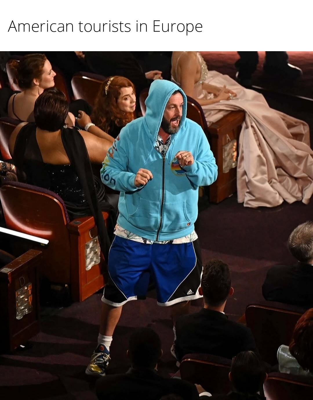 He wears what’s comfortable, there’s absolutely nothing wrong with that. Adam Sandler is famous for shooting movies in exotic/fun locations so that it doubles as a vacation for him and the actors/crew. He’s beloved in the industry, and widely regarded as a good, friendly, loyal, down to earth person. Why on earth should someone like that be excluded from an awards show?