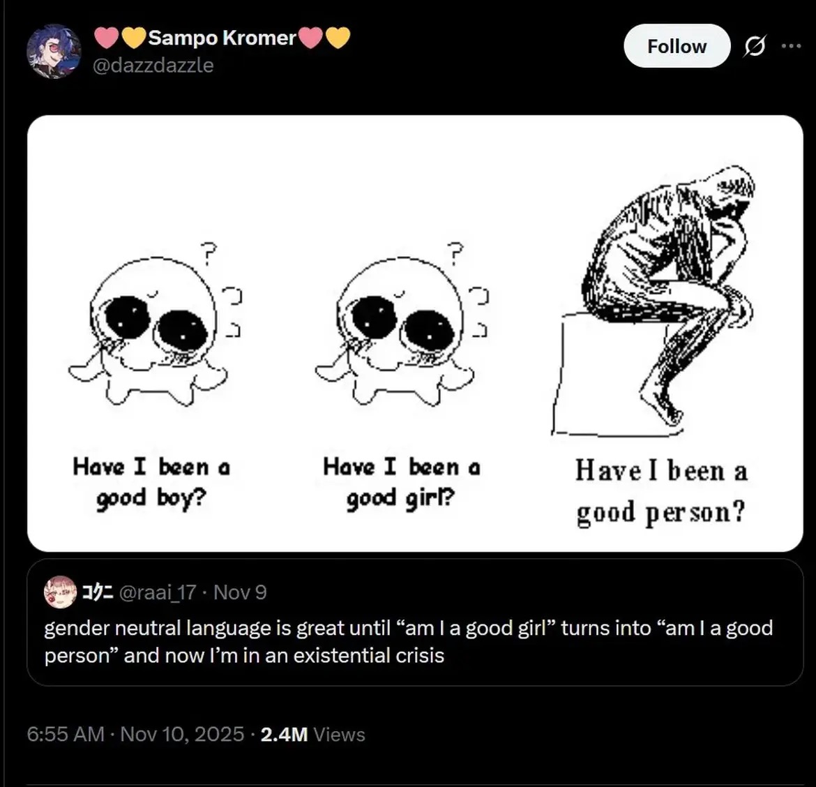 That last one sounds very “I’m terrified I’m a bad person and need reassurance but also need to try to lighten it”