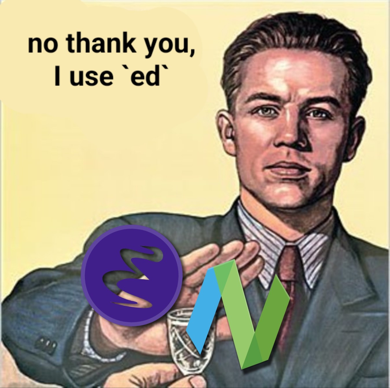 When I use an editor, I don’t want eight extra KILOBYTES of worthless help screens and cursor positioning code! I just want an EDitor!! Not a “viitor”. Not a “emacsitor”. Those aren’t even WORDS!!! ED! ED! ED IS THE STANDARD!!!