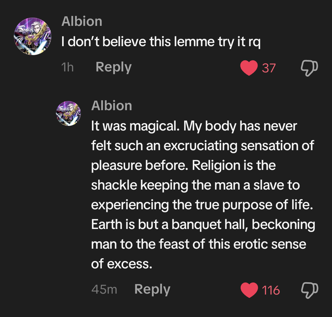 For context: someone made a post asking “if homosexuality is a sin then why did god put male G spot up their ass” and this comment has been born.