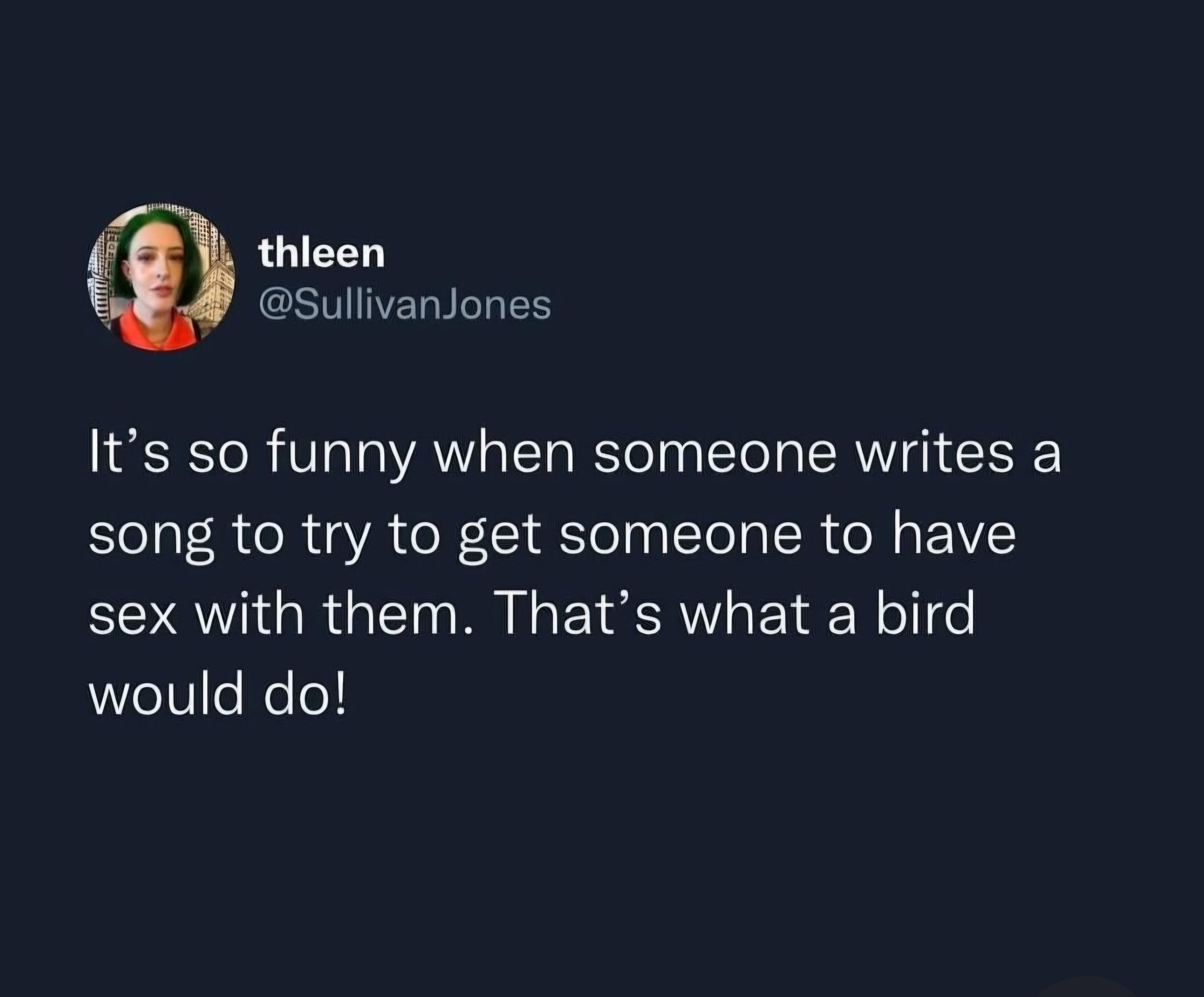 Birds write songs? I always thought that they just scream “I want sex! Who wants sex? Sex, sex, sex!”