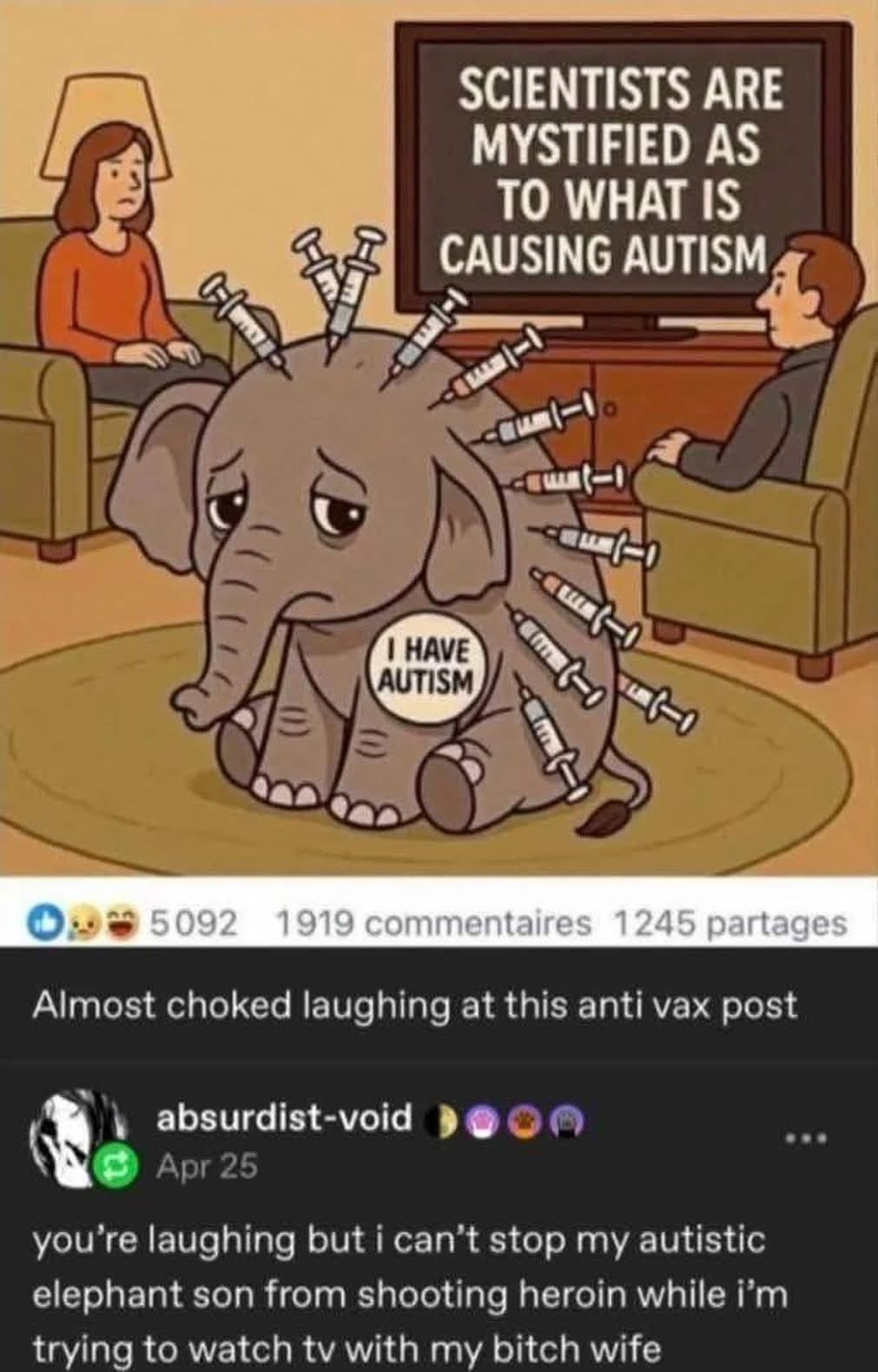 Or because the idiom “the elephant in the room” is being depicted literally (insinuating their medicated autistic child is ‘an unfortunate unwanted fact’ - which I personally feel is derogatory to the child)