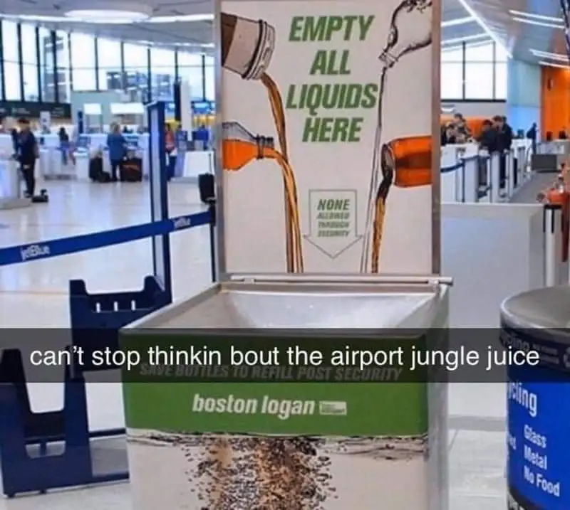 I thought that somebody could sneak a explosive liquid into a plane via cup or bottle, and that the liquid could look so much like coffee or water or fuckin diet Pepsi that the security people were like “nah bro we aren’t gonna test it”.