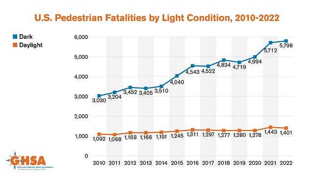 I wonder how much of that increase is from LED headlights, LED street lights, reduction in road safety education campaigns, phone use in cars, glaring LED lit dashboards and other in-car distractions. … Rather than just “cars bad”.