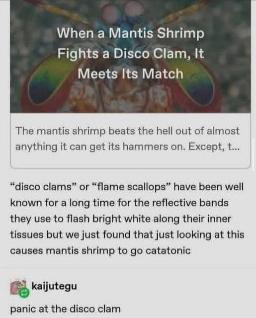 cm0002@suppo.fi to Funny@sh.itjust.works · 2 months agoWhen a mantis shrimp fights a disco clamsuppo.fiimagemessage-square20fedilinkarrow-up1365arrow-down13
