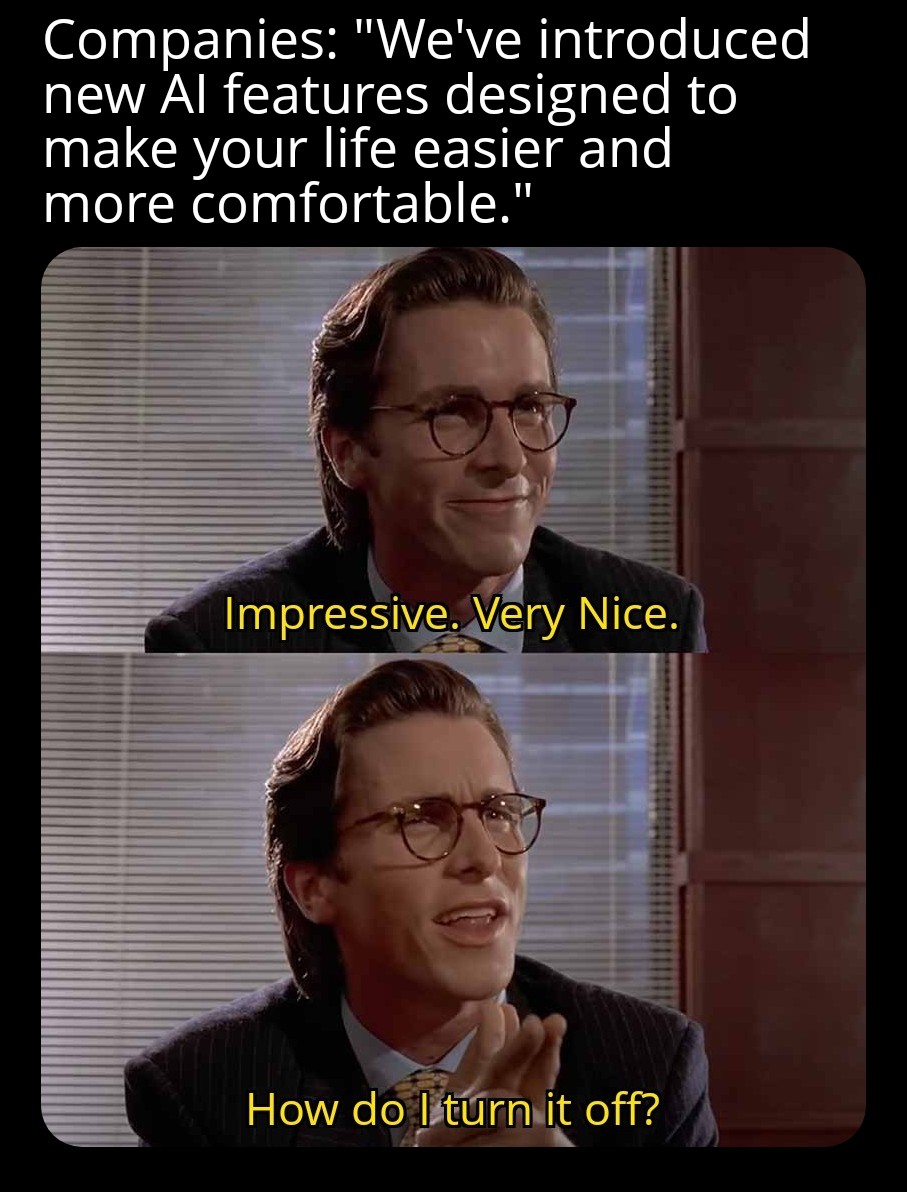 At the least it would be nice if there were a swing in consumerism towards AI-free simple products that just do that one thing we bought them for. And are advertised as such. Somehow I doubt it though. Looking at Lemmy it looks like that’s what people want, but I fear that may be a small bubble in a big sea of idiocy.