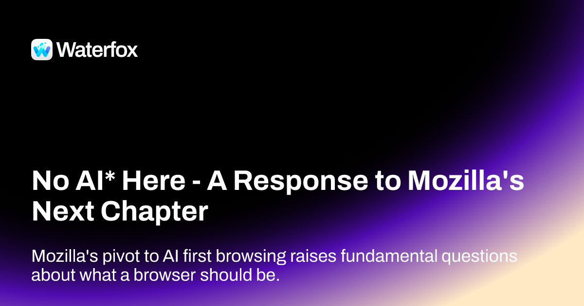 arrow-up1218arrow-down1external-linkNo AI* Here - A Response to Mozilla's Next Chapter - Waterfox Blogwww.waterfox.comNutomic@lemmy.ml to Privacy@lemmy.mlEnglish · 16 days agomessage-square44fedilinkcross-posted to: technology@lemmy.world