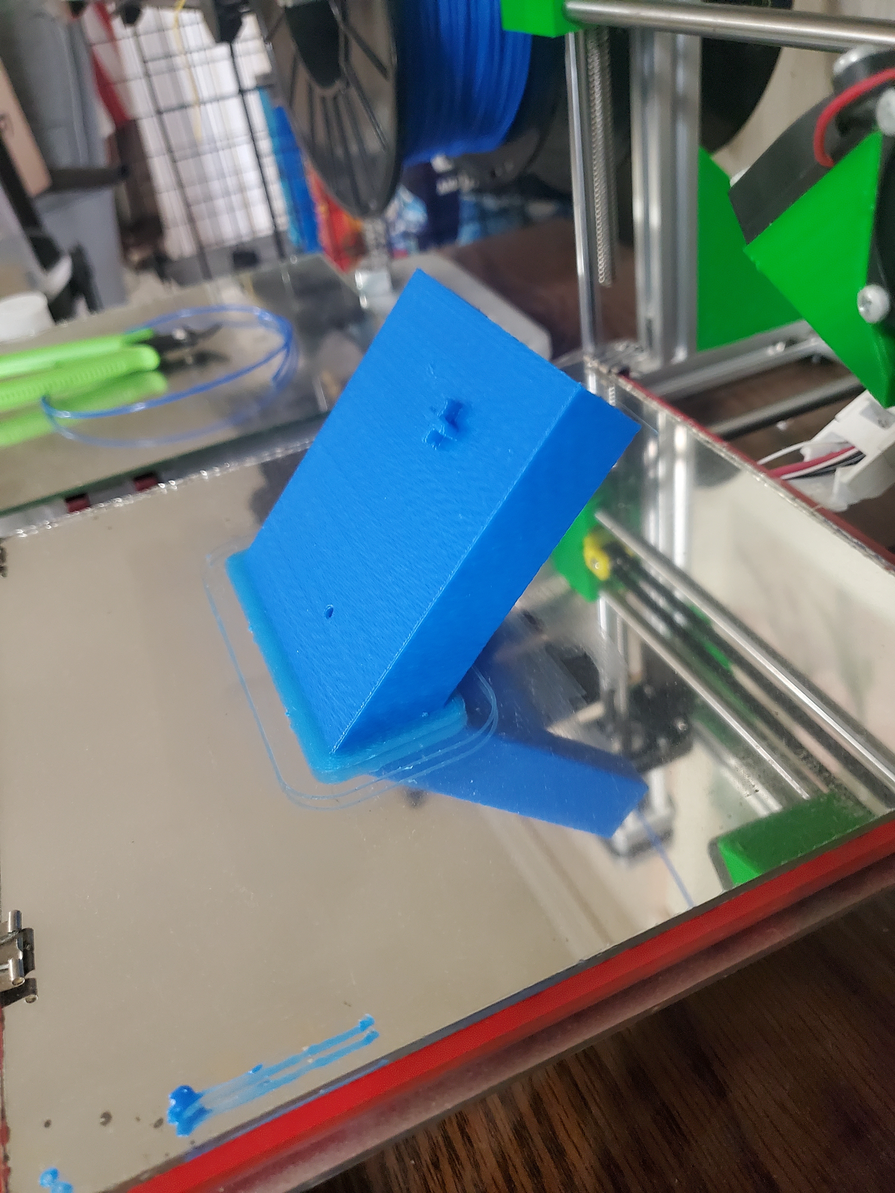 This part attaches a Raspberry Pi in a slightly stupid case I have to an external hard disk. There wasn’t really a way to print it without at least some kind of support material…except leaning back at a 45 degree angle. This printed entirely without supports.
