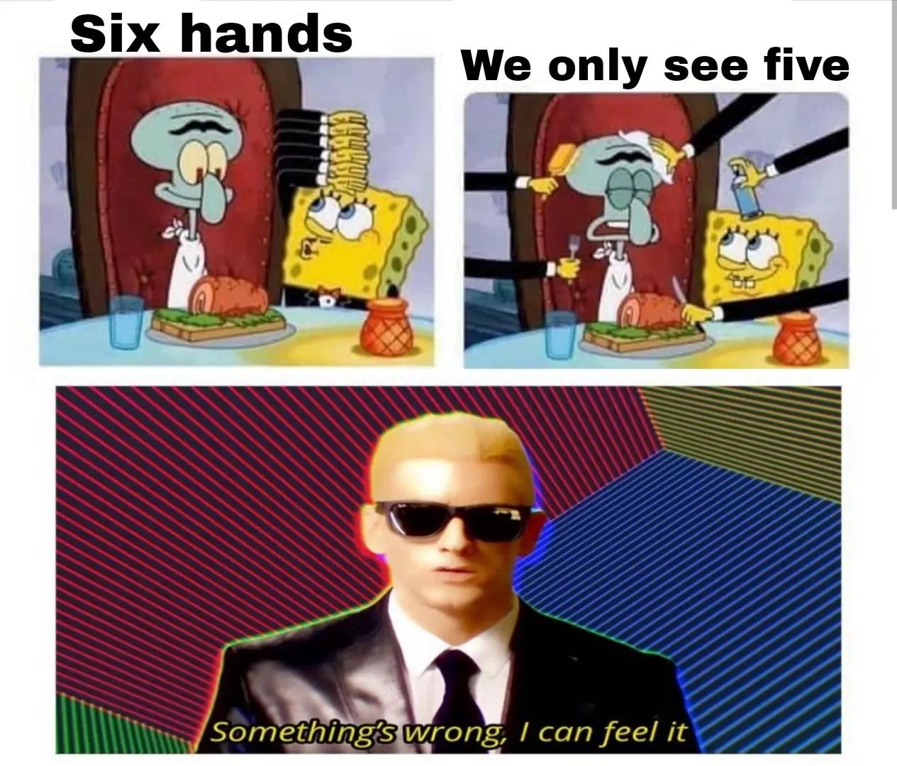 Six right hands and one left. We see four right hands and one left. Two are unaccounted for. Squidward must be packing.
