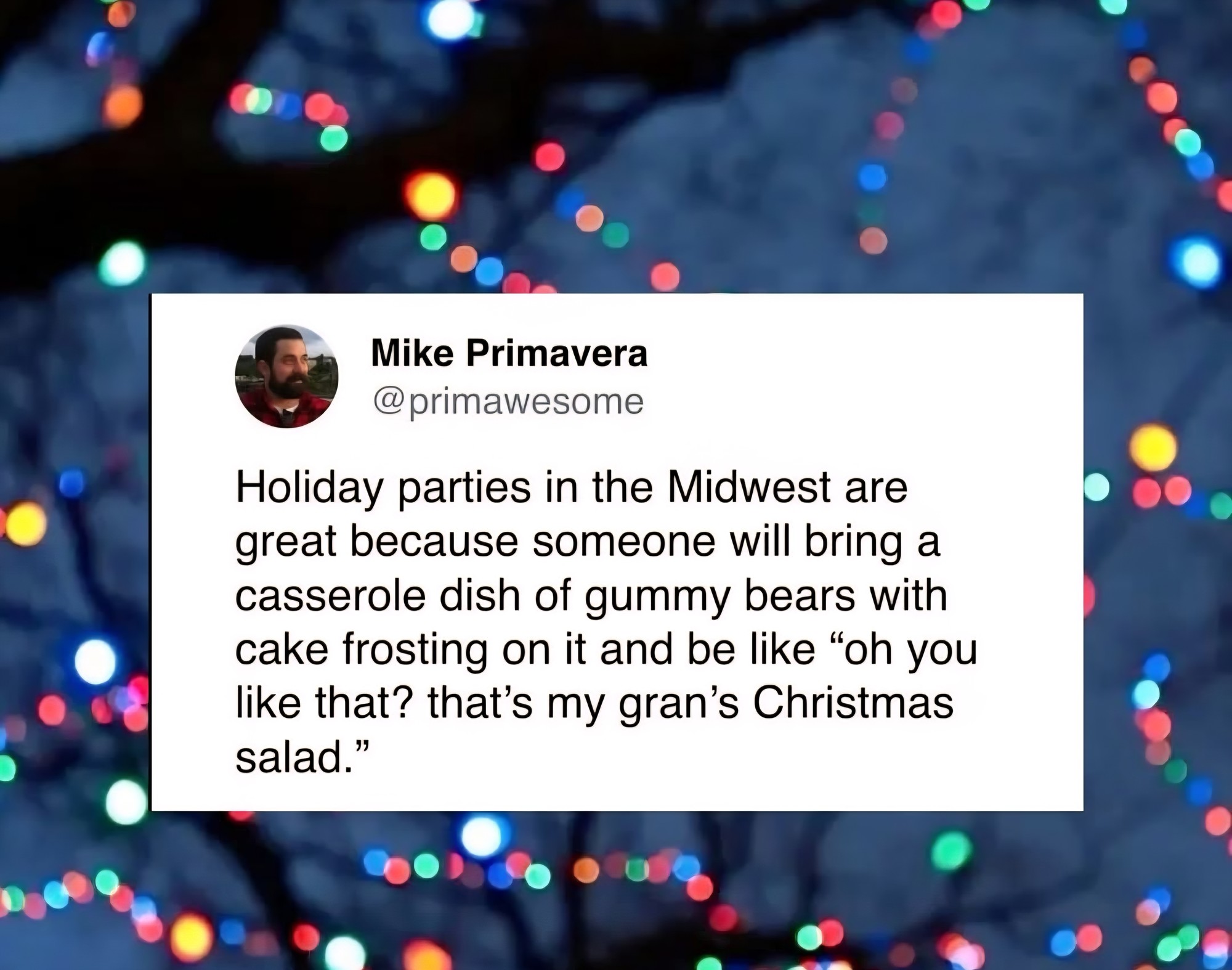 My family (kinda not-quite-northern MN) uses key lime, mini marshmallows, wanna say cool whip, and usually mandarin oranges, but that’s a hit. And someone always brings a whole slow cooker full of meatballs that have been marinaded in there with grape jelly and possibly chili sauce (just the sauce). Those 2 things are so awesome and the meatballs are easy to cook