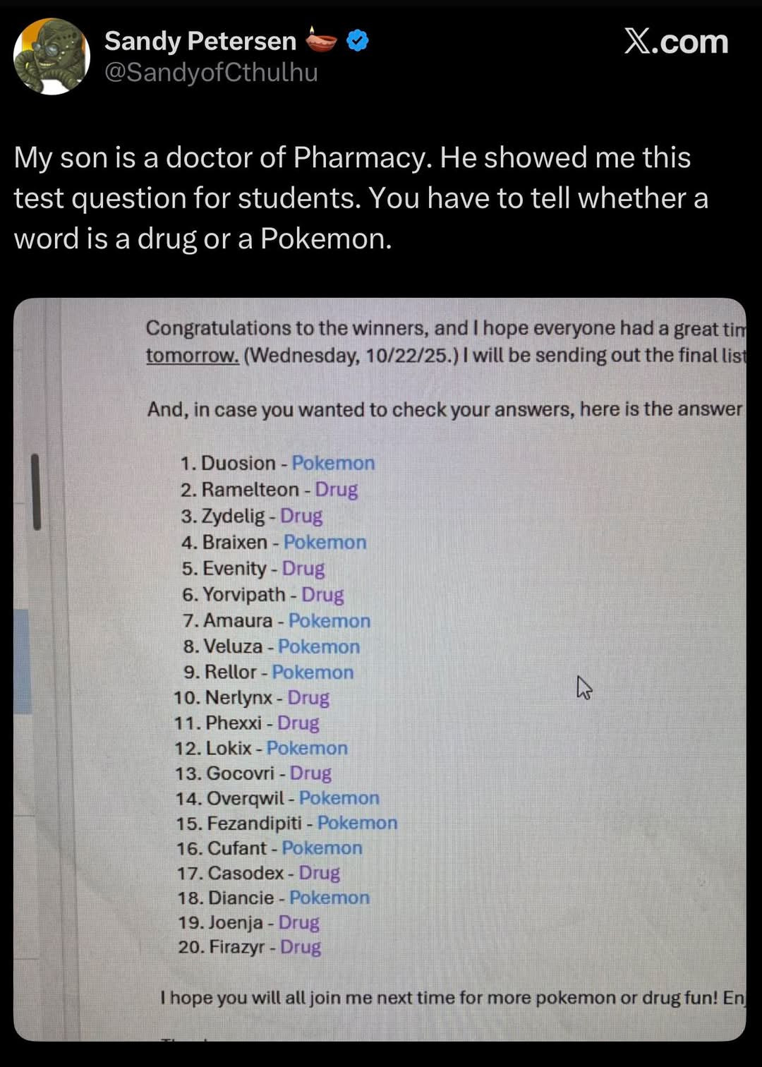 “Congratulations on the winners, and I hope everyone had a great time[…]I hope you will join me next time for more Pokémon or drug fun!”