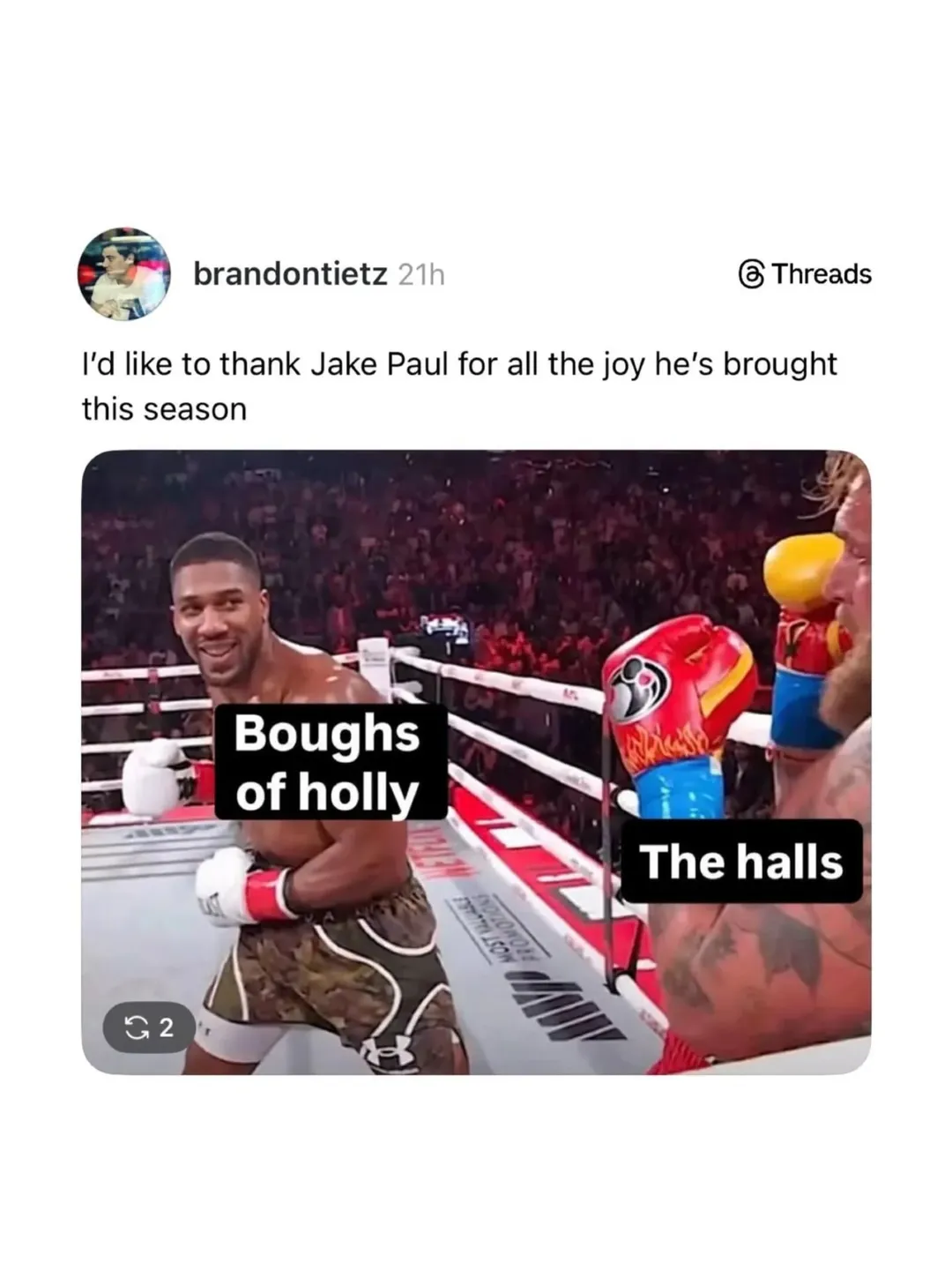 Re the meme: We don’t have to thank Paul for anything; it was Anthony Joshua who delivered what has to be a very short happiness to a lot of people on the internet.