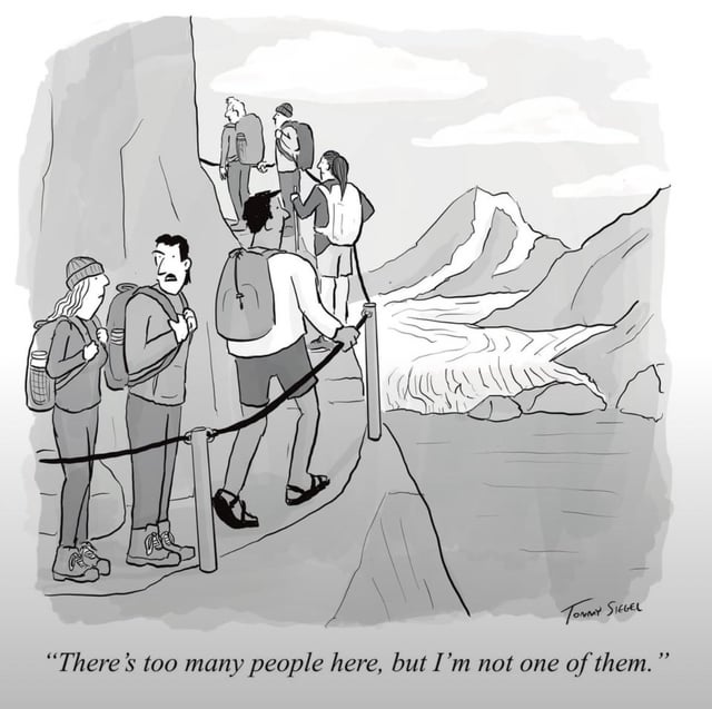 I think I understand the joke, but I’ve seen things from this point of view as well. Something happened during and after pandemic lockdowns that has led to absolutely unprecedented numbers of people going out and hiking what were previously really quiet trails. It was already tough maintaining them before, now you’ve got tons of people who don’t bother to know the norms or understood rules of the parks.