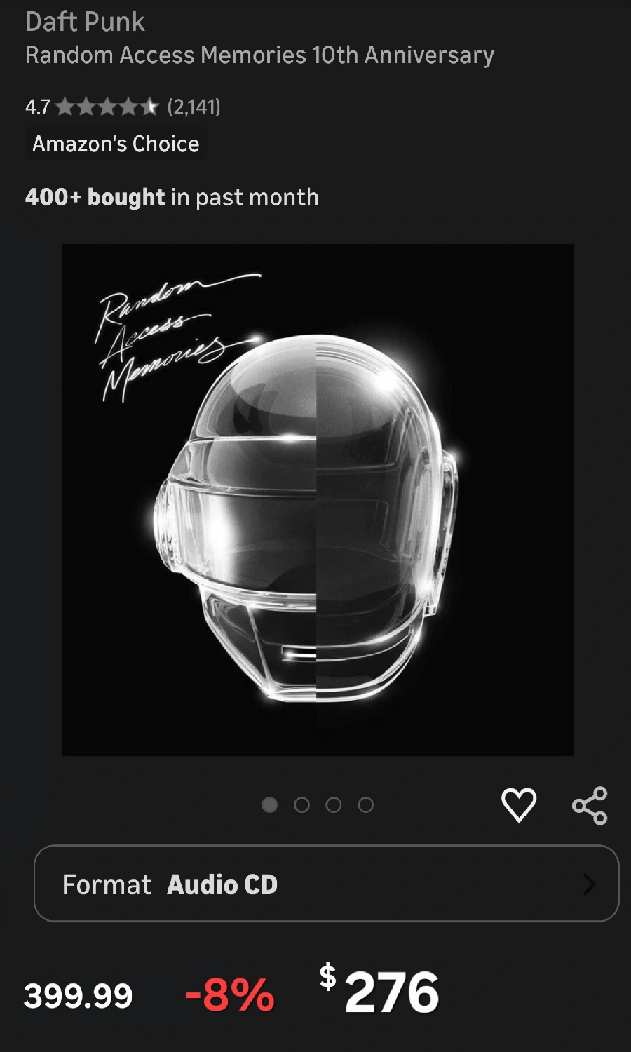 Alt: The Daft Punk album Random Access Memories selling for $276, a good deal since it’s usually $399.99. This is a joke referencing the increase in the price of computer ram.