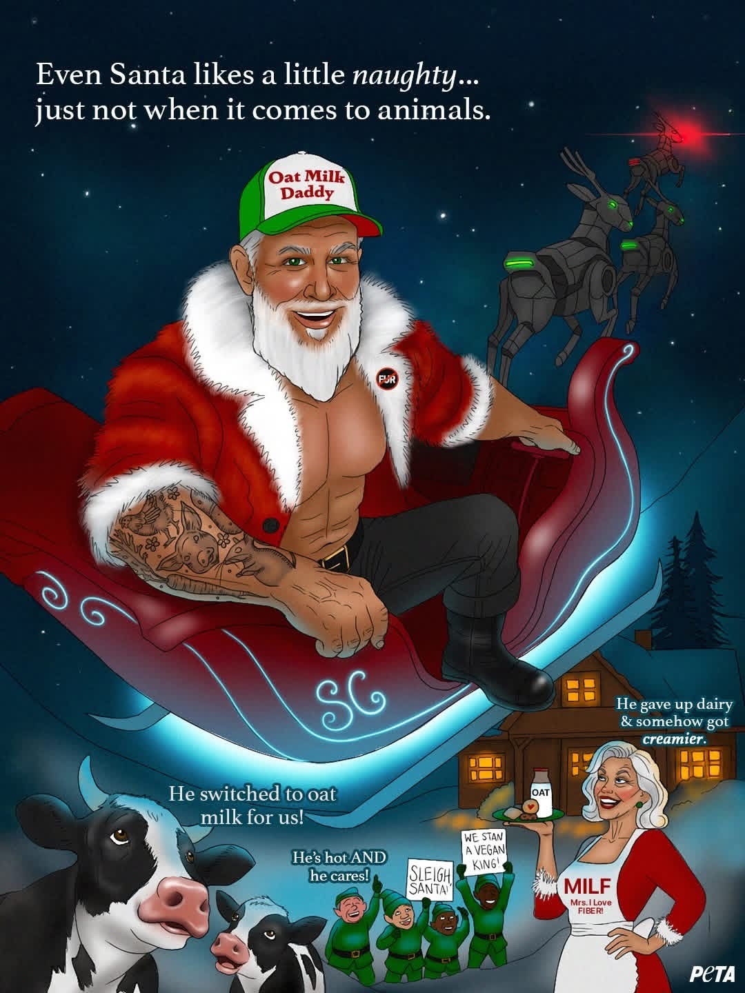 lol. In this new vegan-Santa era, are there no more enslaved reindeer? Have all of the cookies been replaced with vegan options? His suit is most definitely real fur. Judging by the gut, the man loves a juicy ribeye, smothered in butter and onions, daily.