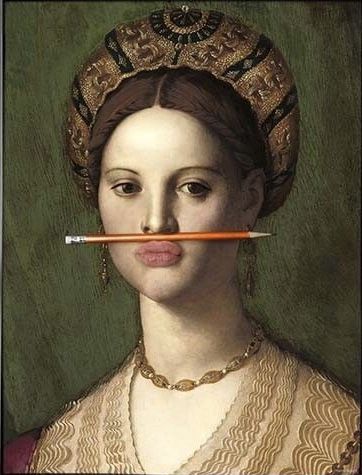 The original painting is real, it’s a Renaissance/Mannerist portrait generally attributed to Parmigianino (c.1530), often titled “Portrait of a Young Woman, possibly Countess Gozzadini,” and the original is held in the Kunsthistorisches Museum in Vienna. The pencil isn’t original — that’s a modern edit.