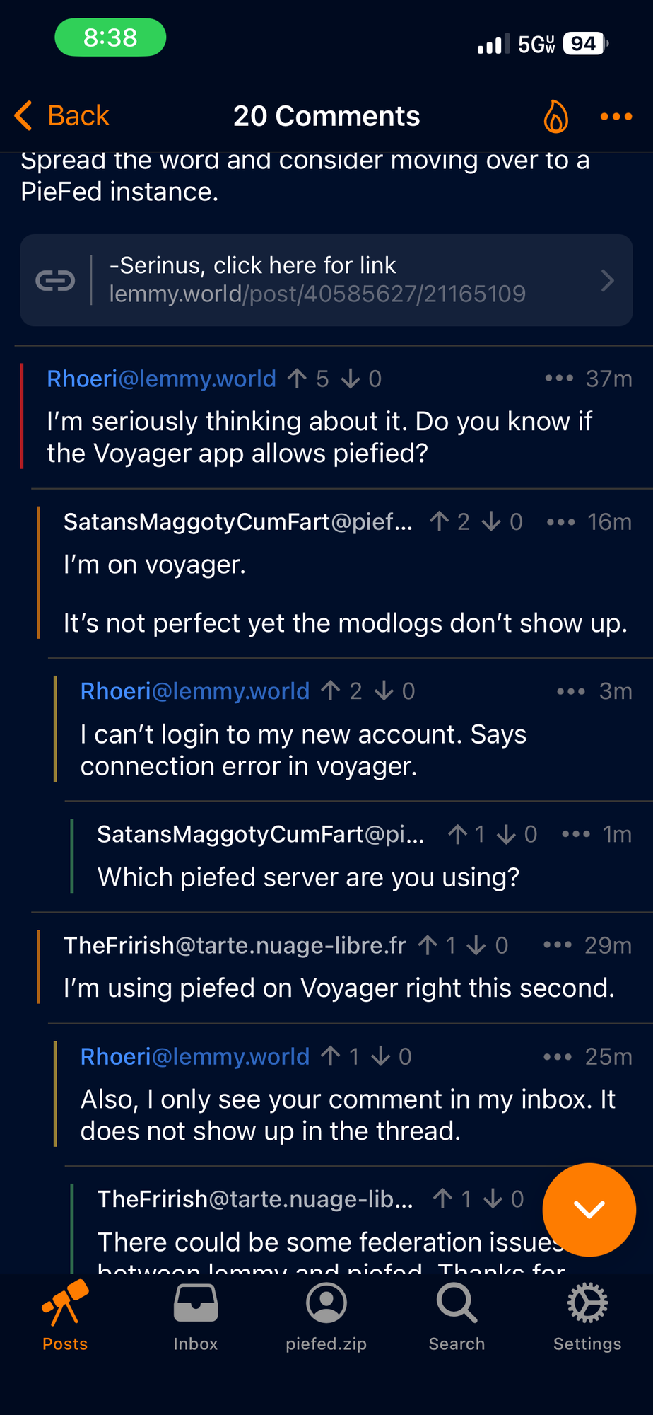 I swing between the piefed website and voyager a lot and a while ago when lemm.ee shut down there would be these periods where I couldn’t connect in voyager, but just fine in the website