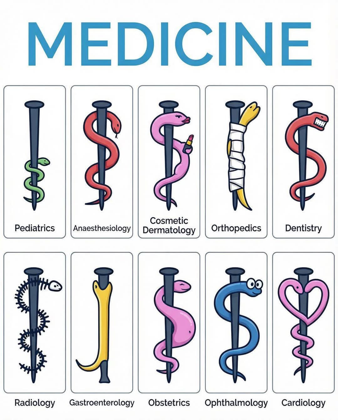 Entirely different things, and I think the meme actually correctly corresponds to orthopedics. It’s a pediatric specialty, and unfortunately, most of the treatments are some form or another of restraining body parts so they grow straight. Hence the snake tied to the rod in order to remain straight instead of wrapping and slithering around.