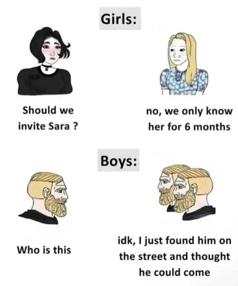 I gotta say this isn’t my experience at all. It’s any gender being any kind of welcoming to new people. That includes me in all positions (being the “haven’t known him for long enough” and “we found him along the way”, and also being the one who does both of those things). If anything my experience has been that women have been more welcoming to new people, of course within reason and depending on the situation. But it’s not at all heavily towards one side or the other, people are people and situational logic plays a larger part than anything else.