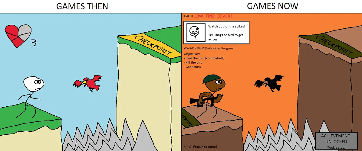 I grew up with super hard games that took months to complete and it was OK. We didn’t know better and there only was one game every some months. Now there are 500 new games every day and I’ve grown out of competition seeking. Beside other modern shit like micro transactions and such, I really am fine with extra hints in games.