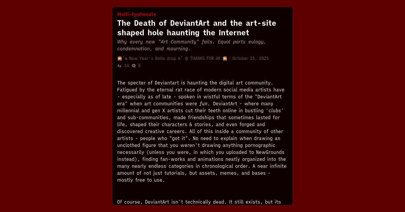 DeviantArt, on the other hand, is quite a bit more unfortunate. It actually has a rather sizeable community still but the heartbreaking part is watching the owners systematically sabotage it. Nearly everything they’ve done in the past several years has been catered towards driving AI use/growth while letting every other part of the site fester and rot. I don’t share my DA profile with clients or family members because if they click off my profile there is an extremely high chance they will be hit by a wall of untagged fetish porn and AI slop that will never be tagged despite the ToS requiring such.