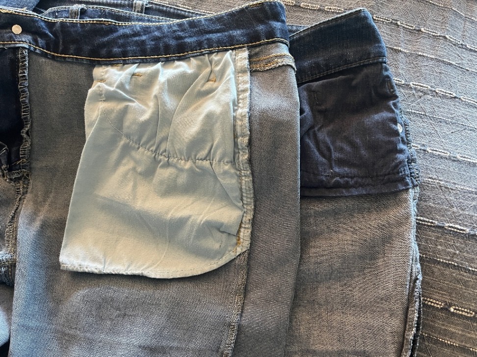 To your second point, I don’t think it would cost that much and definitely not so much that women wouldn’t purchase them. Below is a picture of two pair of jeans I own. Both are thin in the thighs with flares at the bottom and cost roughly the same amount. The one on the right, the pocket barely goes up to my second knuckle, these are jeans that I can maybe clip my knife and keep a lighter in one pocket, but it’s likely the lighter will fall out. The one on the left, while not as large as men’s pockets, fits my entire hand, I can keep my phone, cash, or ID in those pockets without having to worry about them falling out. The amount of fabric between the two is not that much and the cost would not be too crazy.