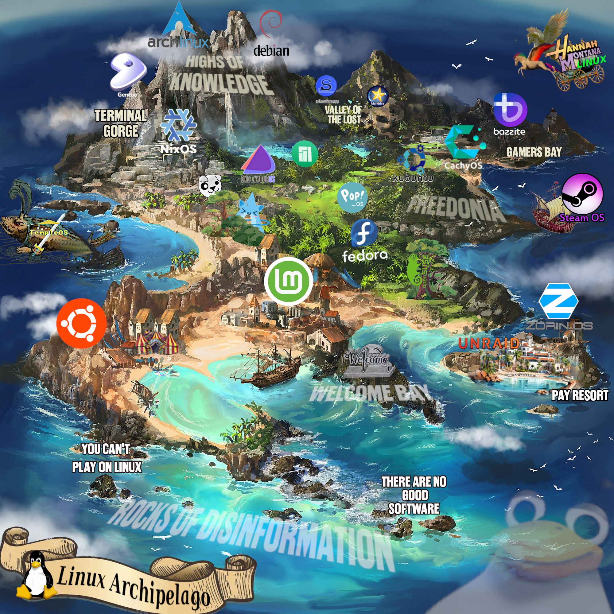 Not really Linux, but TempleOS should be in the fog somewhere. Maybe technically off the archipelago, but close enough to be related to it in some way.