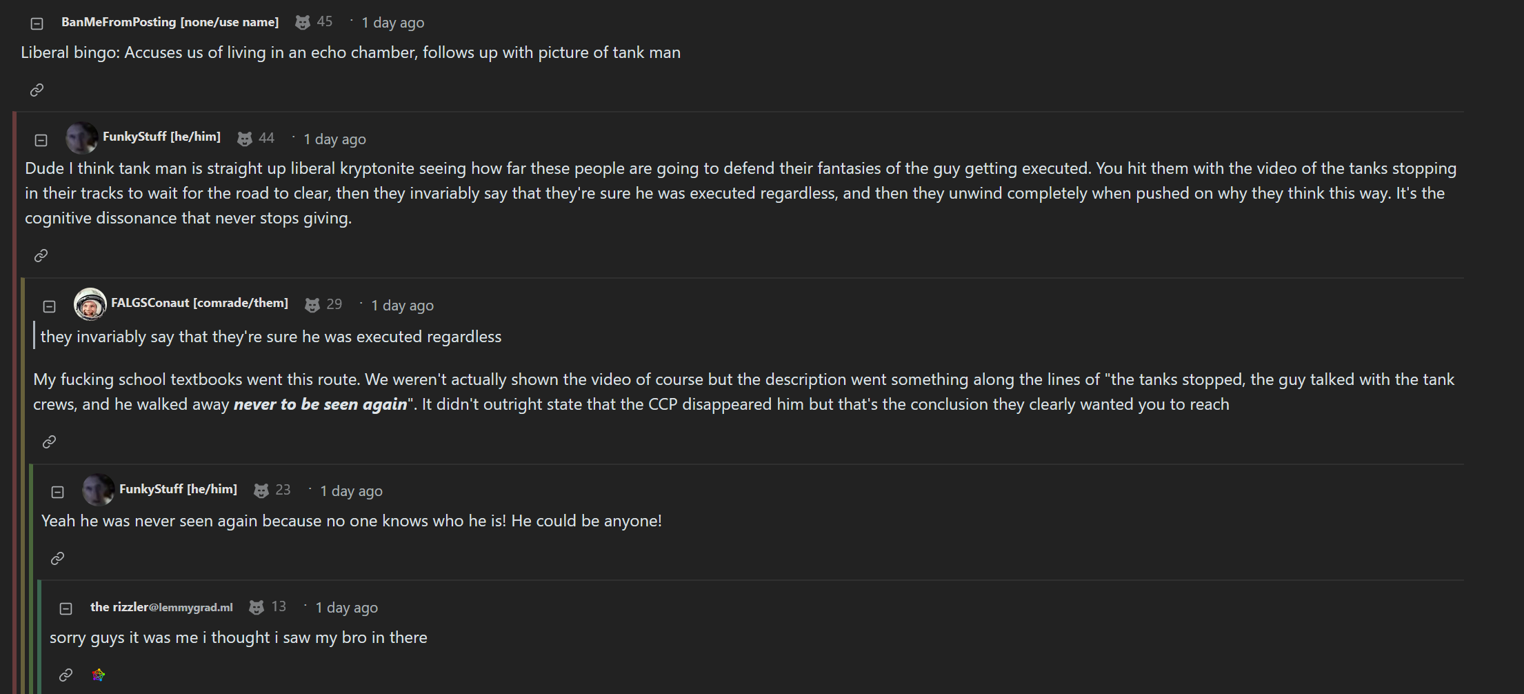 I think this is a telling bingo square of how tankies operate. They know that Tiananmen Square was wrong, they know that student protestors were senselessly murdered and killed with military force – BUT! They can argue that the location was elsewhere! That 9 people died instead of 10!