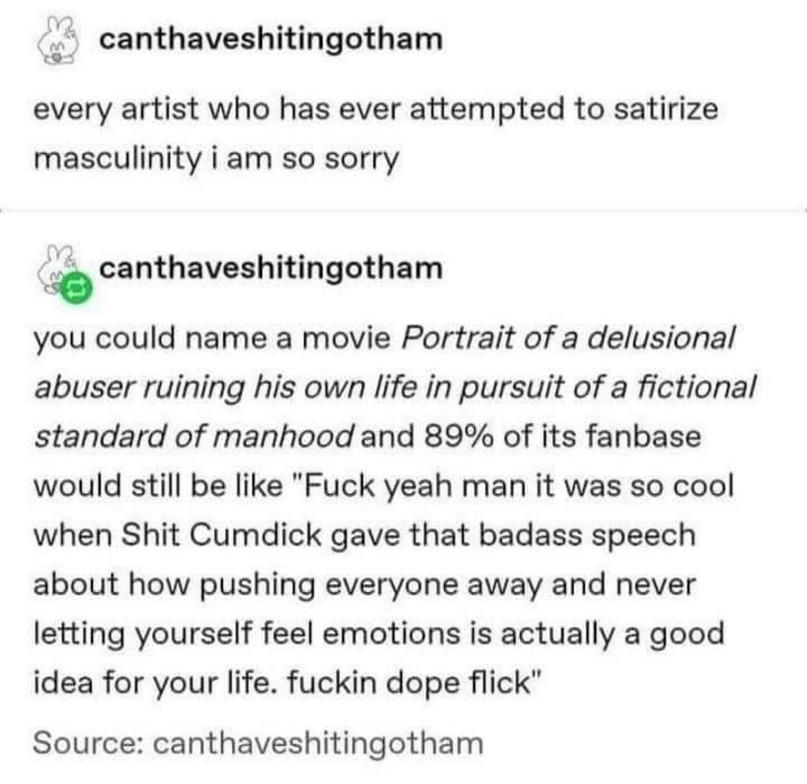 Also, please feel free to list some good examples of positive masculinity in replies below because I and others I know could benefit from seeing more of that.