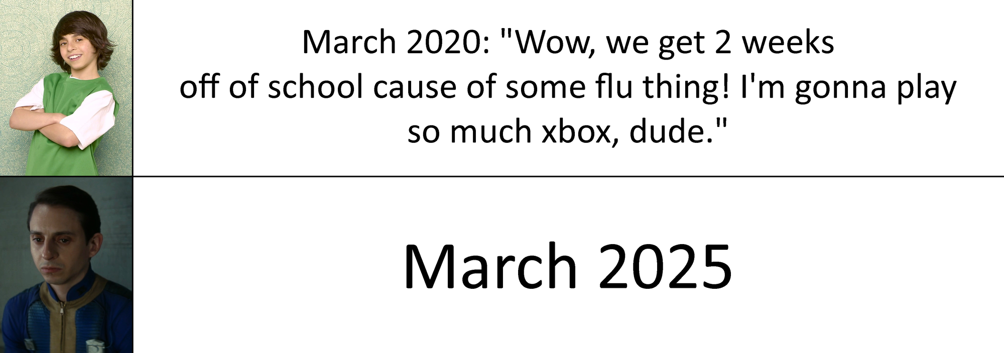Not just March 2025, just everything in those 5 years. The second version is an alt version because a lot of people transitioned in that time, including Myself. The joke is that Moises Arias played Rico on Hannah Montana, a children’s show on the Disney Channel, as well as Norman McClean on Fallout, who is constantly going through emotional termoil