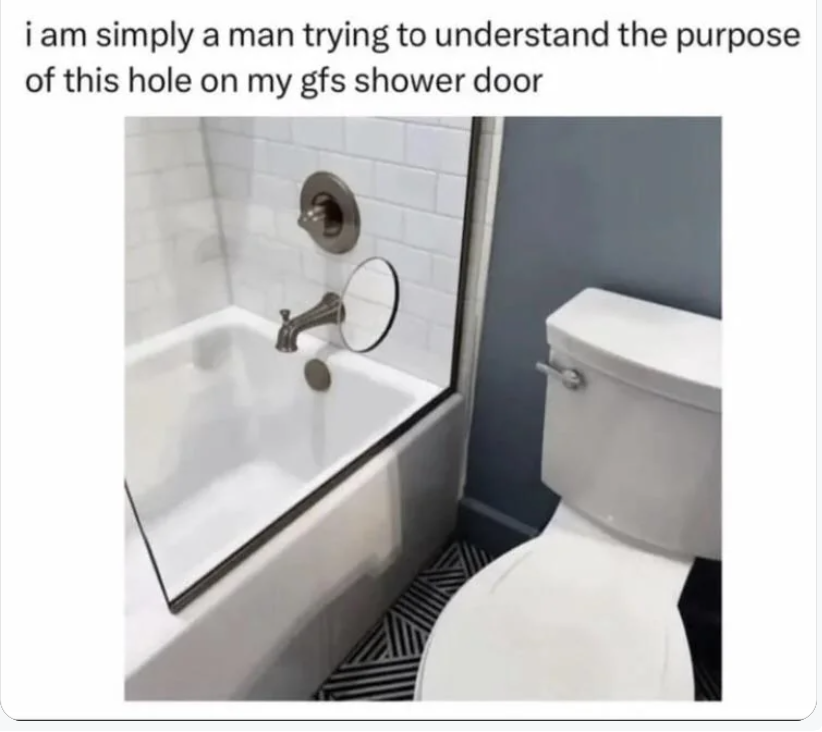 Looks like they installed it backwards, otherwise you’d be able to piss right into the toilet from the shower… because some people think it’s gross to wee in the shower.