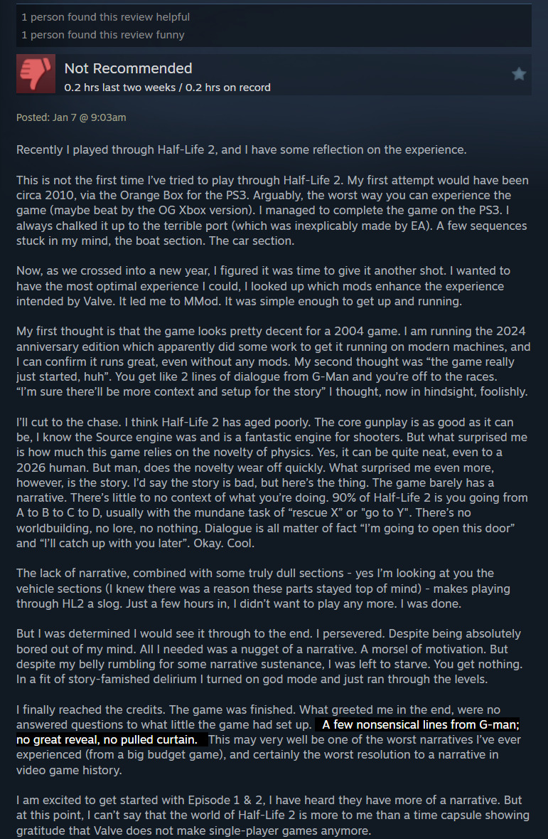 truly dull sections - yes I’m looking at you the vehicle sections … makes playing through HL2 a slog. Just a few hours in, I didn’t want to play any more. I was done.