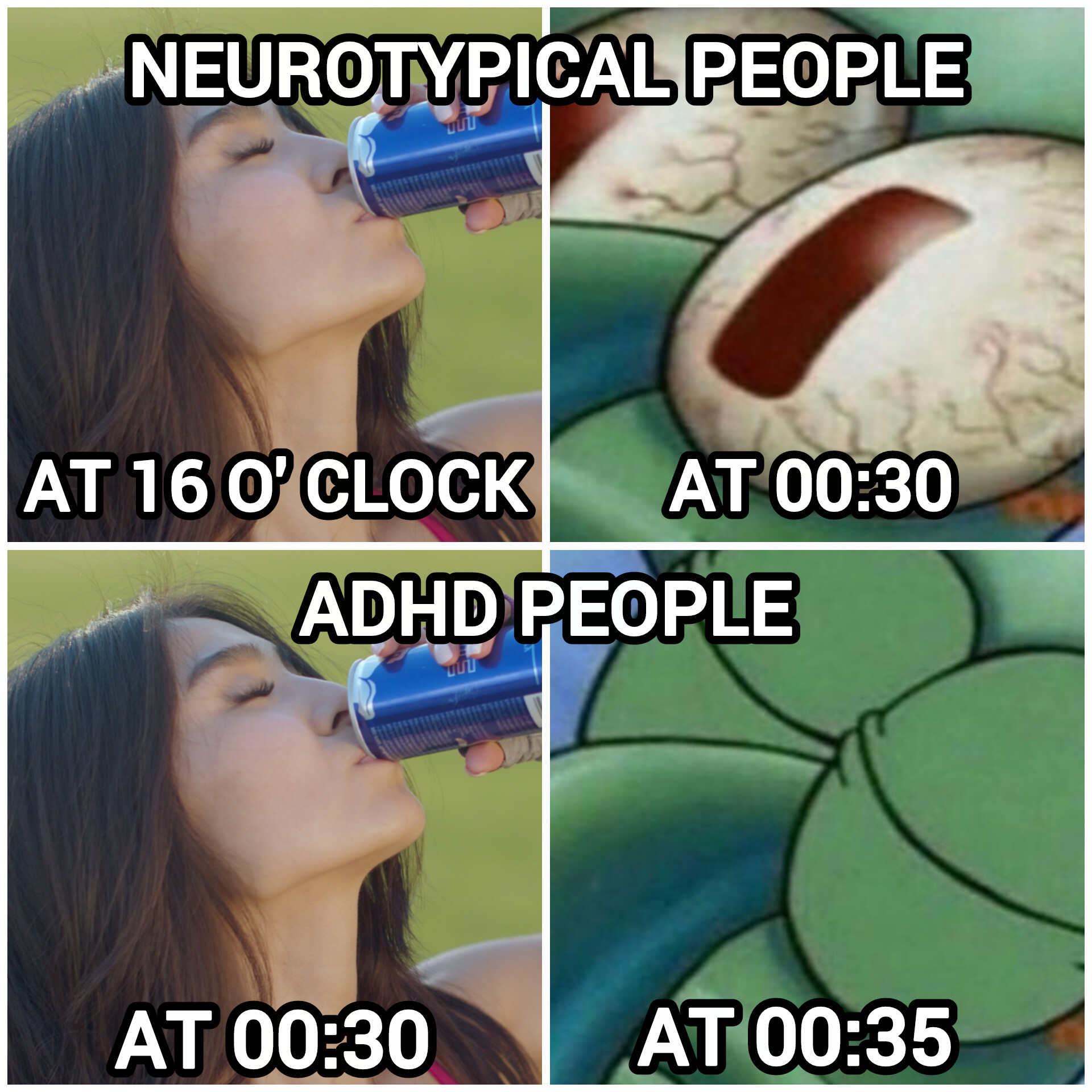 Disclaimer: of course, everything is a spectrum. To ADHD-people, caffeine has varying effects. Some get tired from it, others it affects less or not at all.