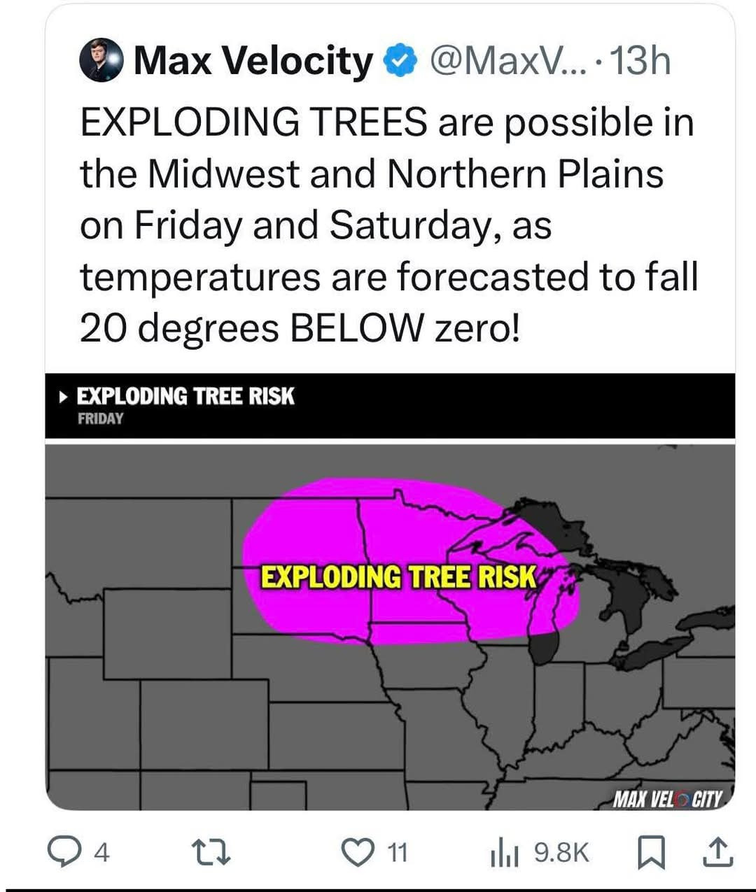 When we get cold snaps before 15f in the mid Atlantic tree sap that doesn’t usually freeze will freeze and limbs will pop. I’ve never seen a tree explode but I’ve definitely heard trees blowing limb and bits of themselves in the woods. Wind exacerbates the phenomenon