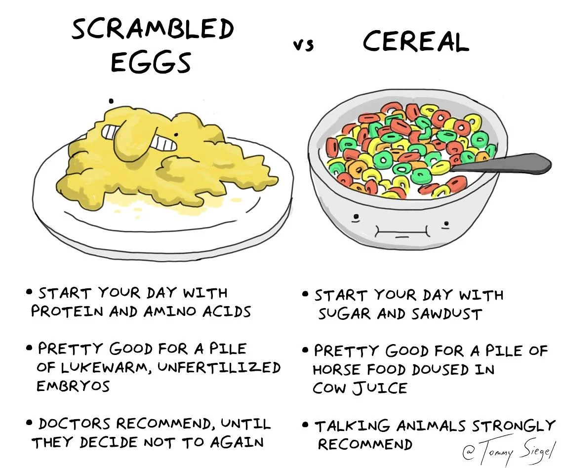 This actually aligns with what RFK jr is pushing. They always used to say cereal was more healthy though. (Like not sugar shit but healthy cereals with bran and wheat and oats and nuts and whatnot.) Though I’ve always eaten a lot of protein and I like eggs. I hate that I seem to agree with RFK on something. Probably because it actually isn’t as healthy. Which is why I like it.
