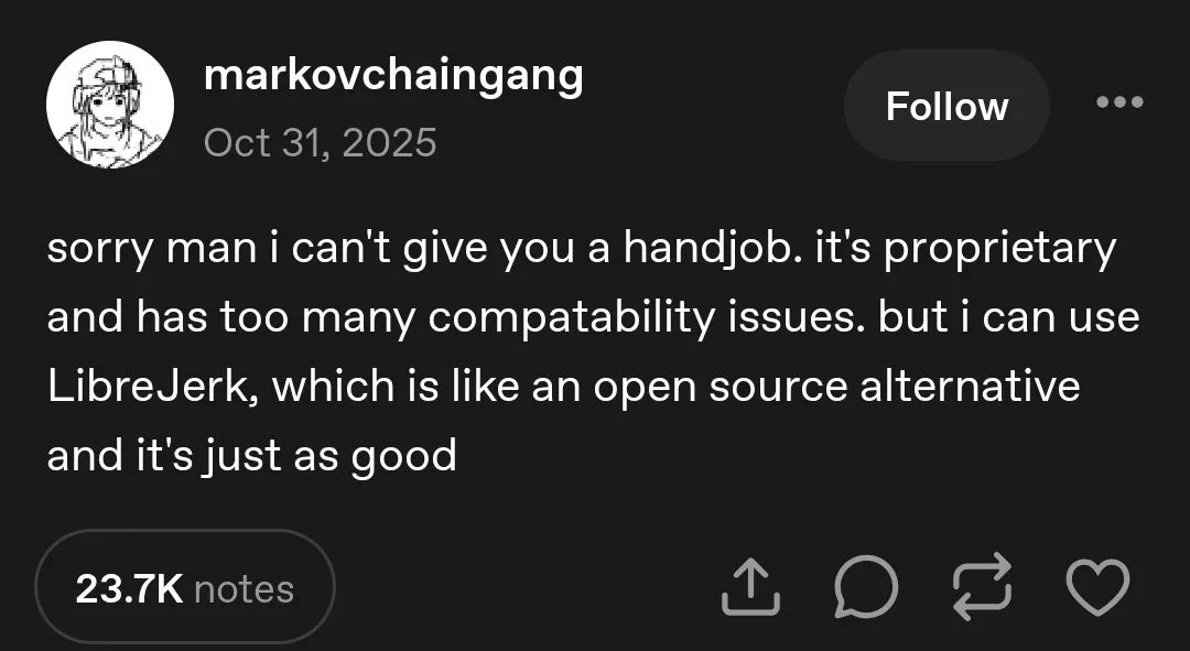 NSFWtranscription: sorry man i cant give you a handjob, its proprietary and has too many compatibility issues, but i can use librejerk, which is like an open source alternative and its just as good
