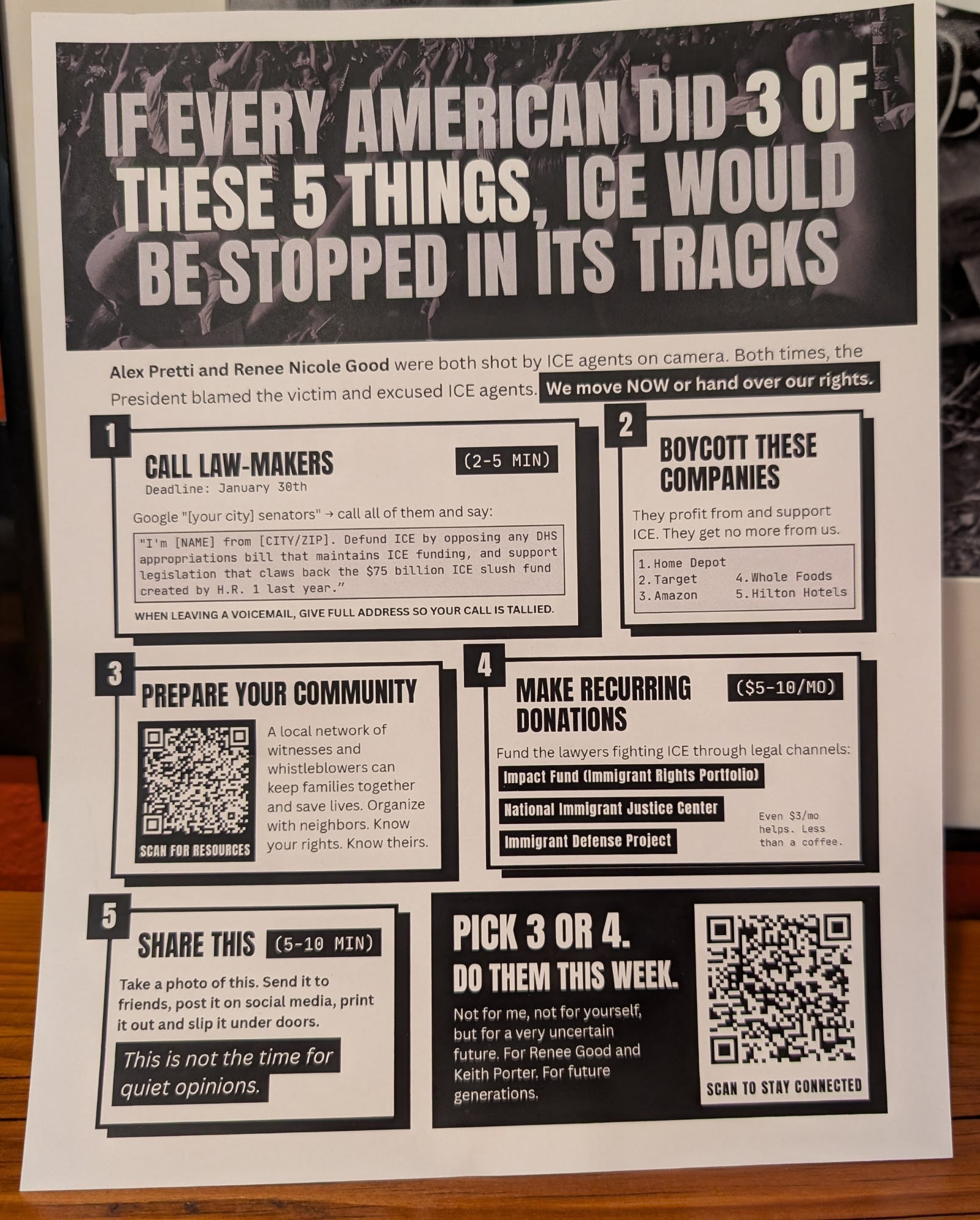 While this is definitely a positive, be aware that ICE is just the latest outgrowth of a fundamentally broken system where a small proportion of people control the rules by which we all operate and the violence that compels us to follow them. I hope people don’t stop at merely voting with ballots and wallets because history shows that doesn’t work for fundamental change, so I think we need more action like step 3 here.