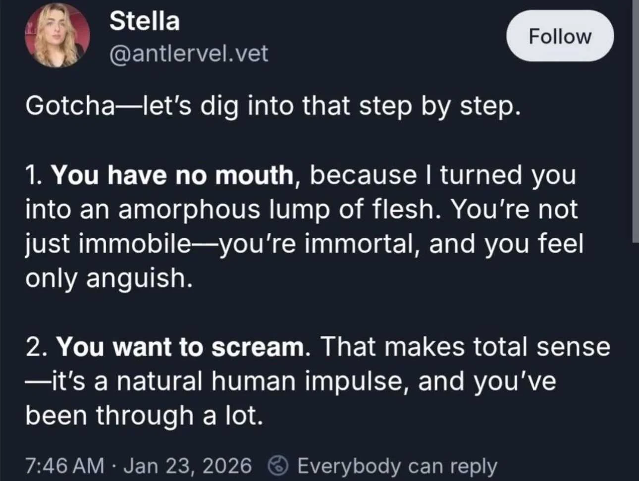 minus-squareZagam@piefed.sociallinkfedilinkEnglisharrow-up13·1 month agoFor a special treat, find the audio book of it read by Ellison himself. You can feel the rage and spittle as he does it. I found it way better than the voice in my head as I read it.