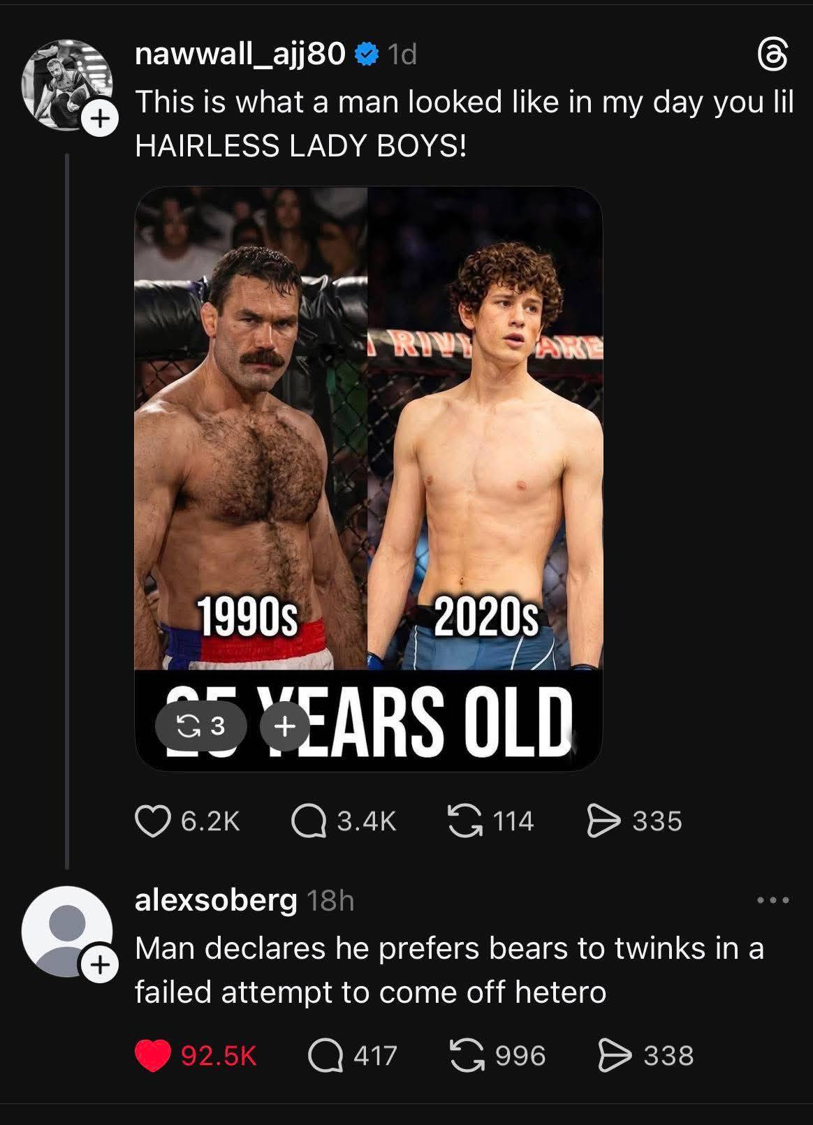 From what I can Google, the guy on the right is around 25 in that pic. Since when is “looking 40 when you’re 25” considered a good thing? Also there are plenty of photos of him with his chest shaved.