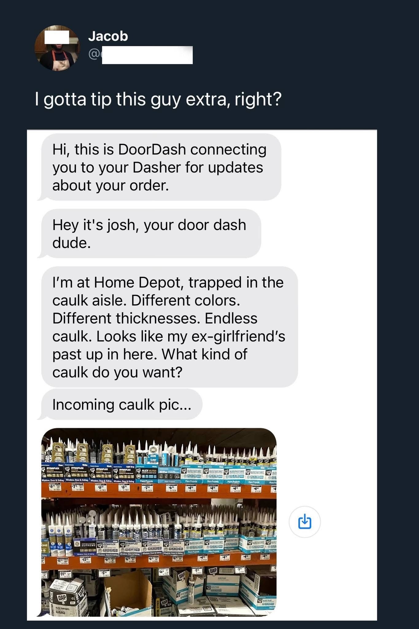 Ordering caulk via Doordash, is that seriously a normal thing that people do now?