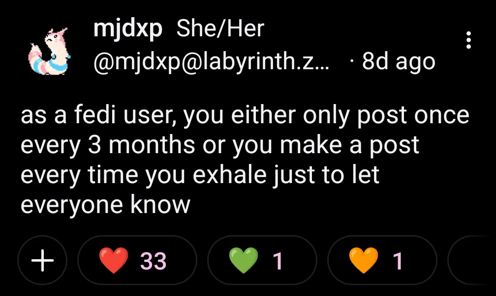 I do the same. I like the Fediverse and want to help make it a nicer place, but I am too critical of the messages I think of sending. I often think of a message and then go “Nah that is pretty similar to what the other guy wrote, it won’t add anything new”. But maybe it makes sense just so you can see others have the same experience (other than looking at your upvotes) or maybe it makes sense because it will mean comments for bored people to read through. At least that is what I try to tell myself because otherwise I won’t be writing many comments.