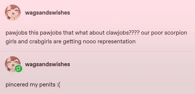 transcription: pawjobs this pawjobs that what about clawjobs??? our poor scorpion girls and crabgirls are getting nooo representation… picered my penits :(