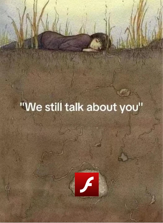A drawing of a person laying on the ground, seen from the side. There is text on the image, “We still talk about you”. Deep in the ground, there is the Adobe Flash logo.