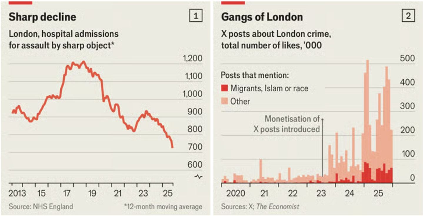 These two graphs cover different time periods. It looks like the monetization of X lines up with that hump of sharply increased knife crime at the end there.