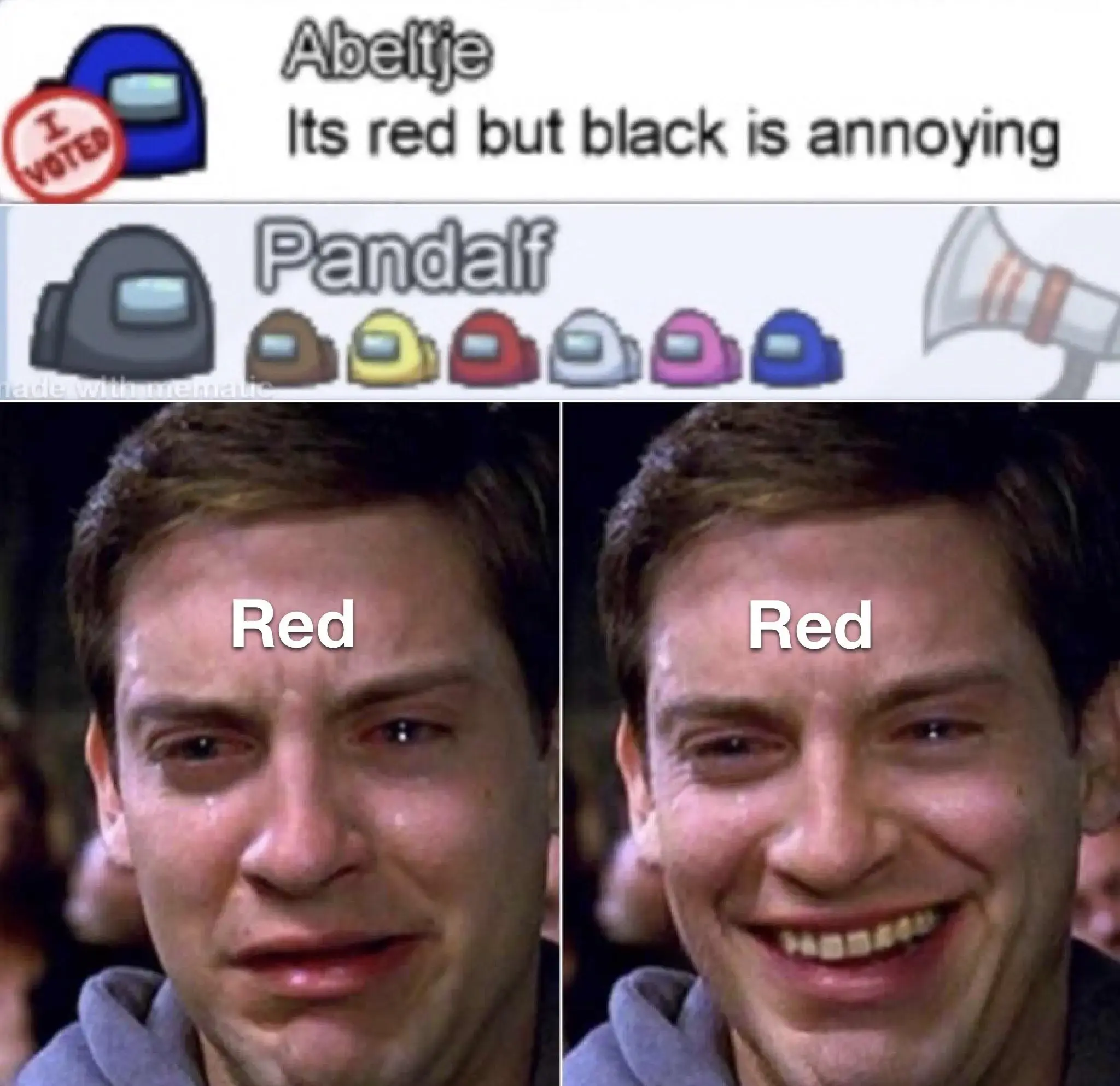 The bottom pictures depict Red crying at being found out, but smiling because the crew chose to vote out someone else instead.