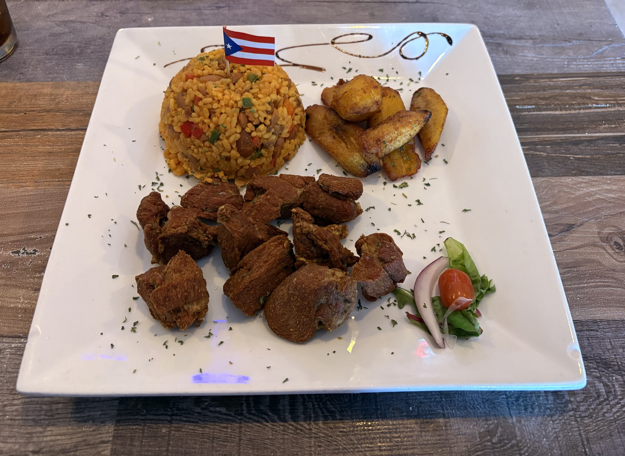 “Lechón frito, arroz con gandules, plátanos maduros”…and a salad?