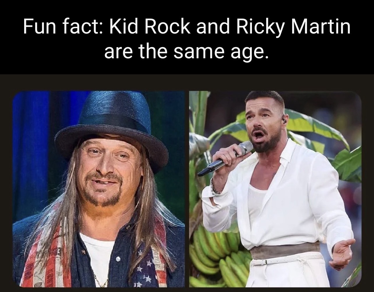 arrow-up1682arrow-down1imageRicky Martin is aging like wine, Kid Rock is aging like milk left out in the sun in Arizona.lemmy.worldWanderWisley@lemmy.world to memes@lemmy.world · 3 days agomessage-square93fedilink