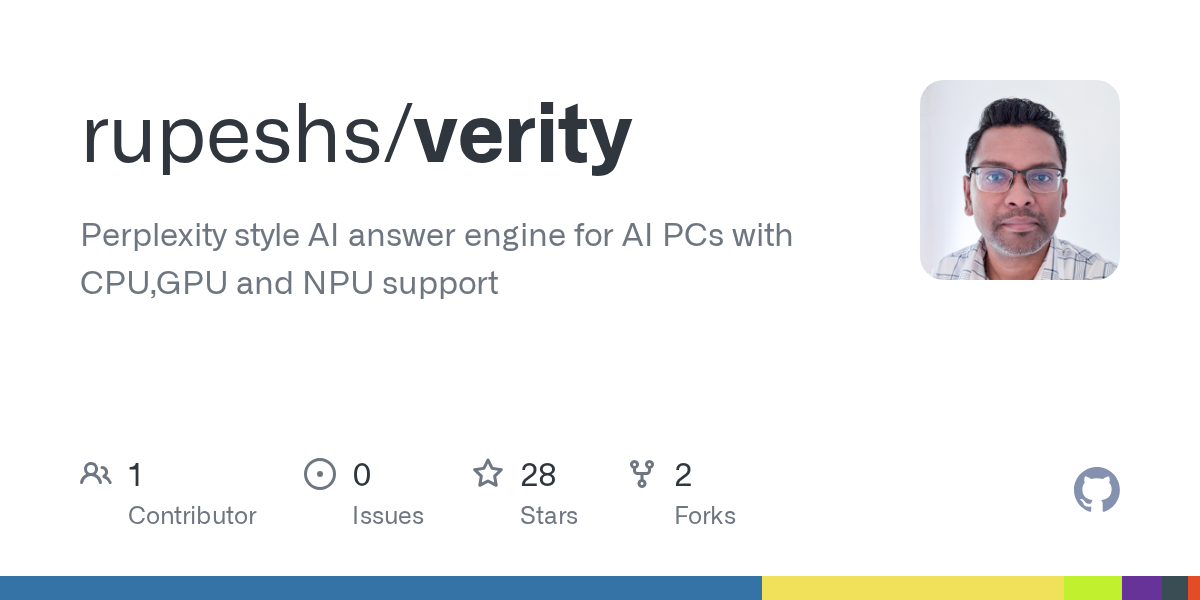 ☆ Yσɠƚԋσʂ ☆@lemmy.ml to Technology@lemmy.mlEnglish · 6 days agoVerity,a Perplexity style AI search and answer engine that runs fully locally with CPU/GPU/NPU accelerationgithub.comexternal-linkmessage-square7fedilinkarrow-up18arrow-down11